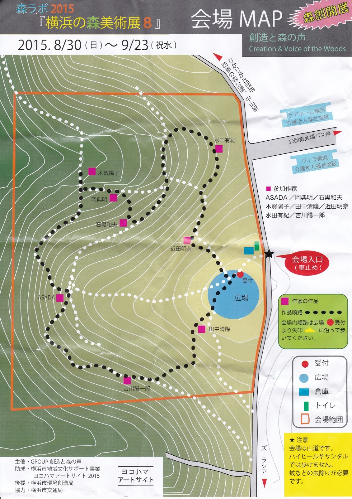 Hi there! A bit late weekly posting for Adventure this time. I report you this year’s annual exhibition, “Art Exhibition in the Forest of Yokohama 横浜の森美術展” by Laboratory of the Forest 森ラボ, August 30 - September 23, 2015. The event is organized by GROUP the Creation and Voice of the Woods 創造と森の声. (Phone/FAX: 045-933-1460, Mobile: 090-1777-5881, Email: morinokoe2@yahoo.co.jp. Membership fee: 1,000 yen. Their Facebook is here.) GROUP was active since 1997, and this is their 19th annual art exhibition within the forest. The exhibition titled Art Exhibition in the Forest of Yokohama is its 8th this year, with the theme “Shinso Kaiten 森創開展.” As a related event, during August 23 - September 13 there will be an exhibition for the concept of the event, “Woods-ArtLand-Town,” in the concourse of Nakayama Station of Yokohama CitySubway. From August 23, a weekend event is going on just beyond the exhibition entrance to create an installation with flags by anybody who bother to go there. (10:00-14:00, free.) Today, 30 August 2015, an opening party was held, where artists presented their installations by themselves, and later open-air concerts. The photos and video of today’s party would be uploaded at the Facebook page of GROUP, eventually (they say). So let’s just keep crossing our fingers …